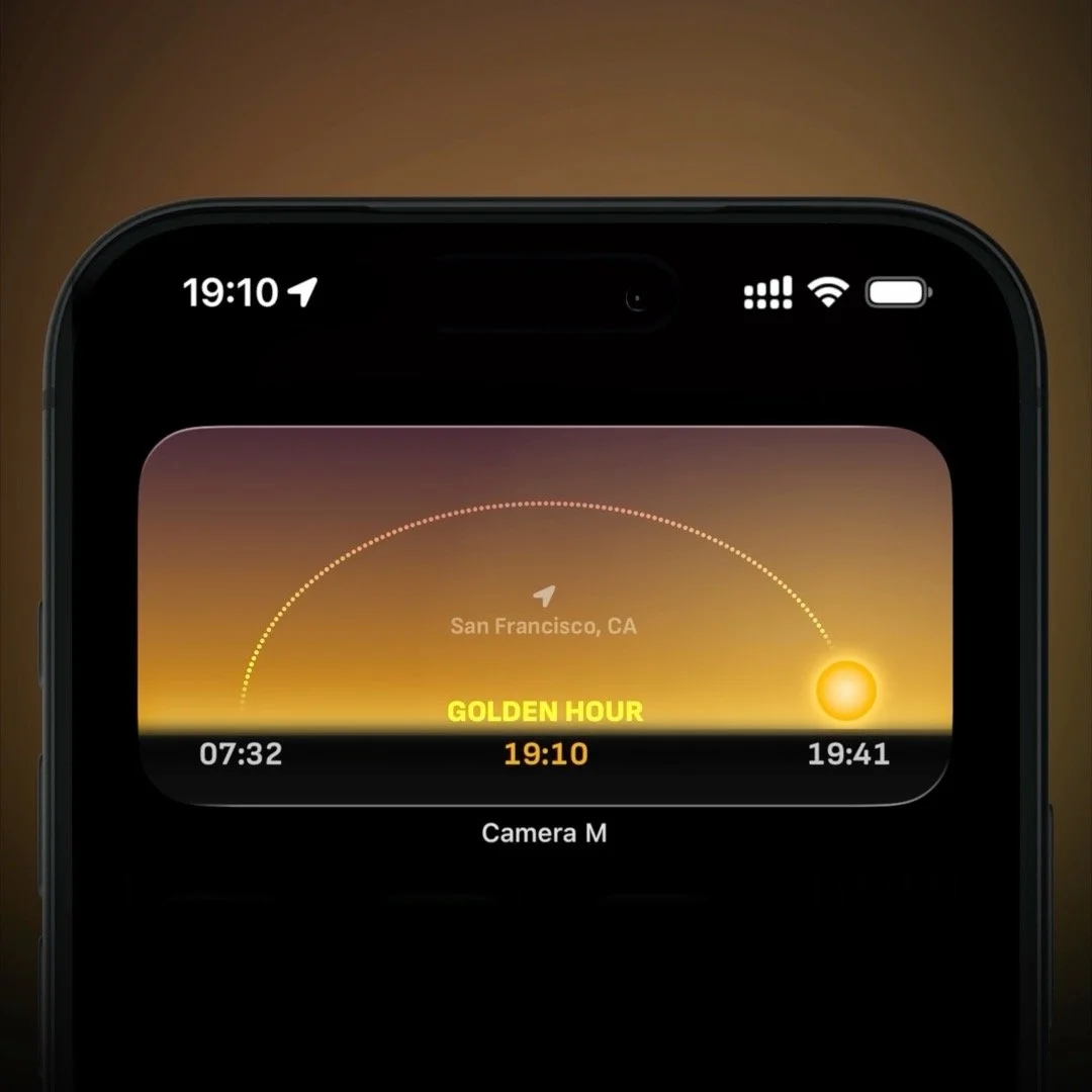 Golden Hour widget displays precise times for sunrise, sunset, and Golden Hour, along with the estimated sun position to assist natural light photography. EXIF widget displays summarized EXIF metadata for the last item in your Camera Roll. Cameras widget displays basic hardware specifications for available rear cameras and helps you launch Camera M in a chosen camera mode.