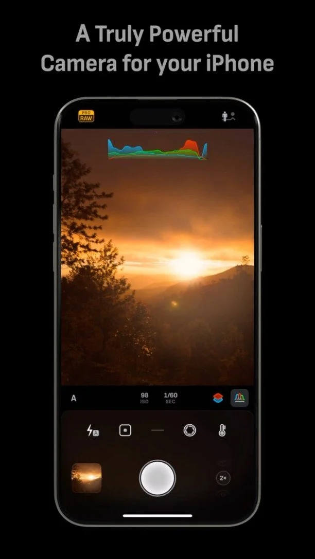 iPhone camera exposure consists of two components: ISO and exposure duration. Just swipe to change exposure bias or use a dedicated, split-screen, manual exposure screen to precisely dial in the values you need. Semi-priority modes assist you by adjusting the opposite value for you to keep the same exposure offset. Live RGB and luminance histograms, along with highlight and shadow alerts are always ready to assist.